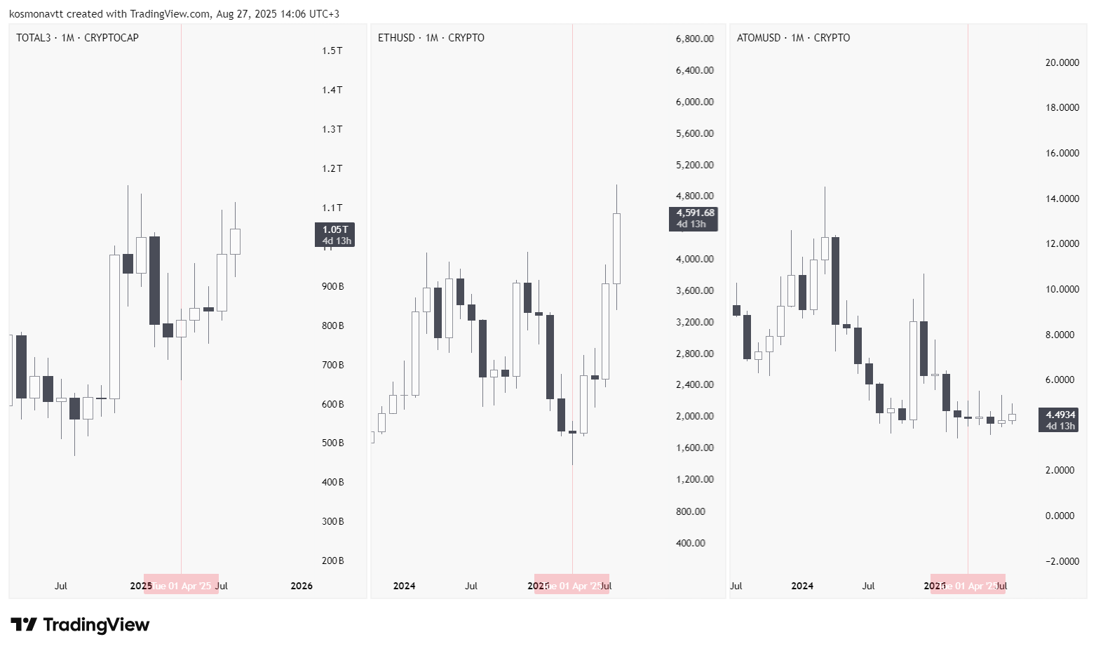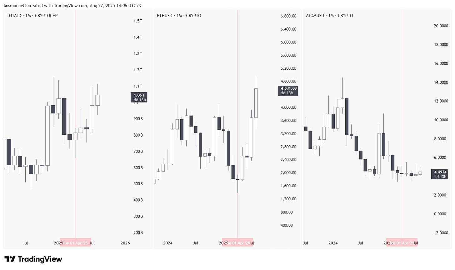 На скриншоте представлено сравнение трех графиков: TOTAL3 (рыночная капитализация альткоинов) / ETHUSD / ATOMUSD.