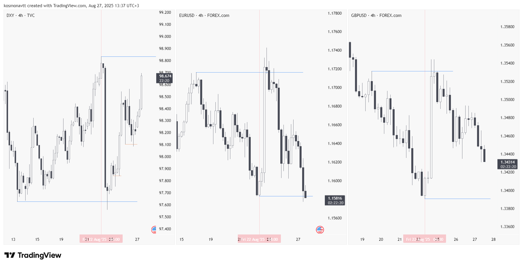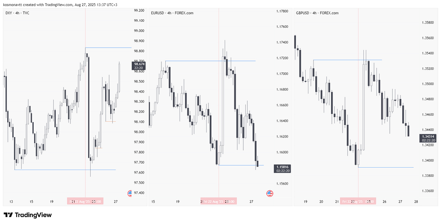 На скриншоте представлено нисходящее движение начавшееся 22 августа 2025 года. Если вы обратите внимание, то EURUSD смог достичь цели, однако DXY и GBPUSD нет.