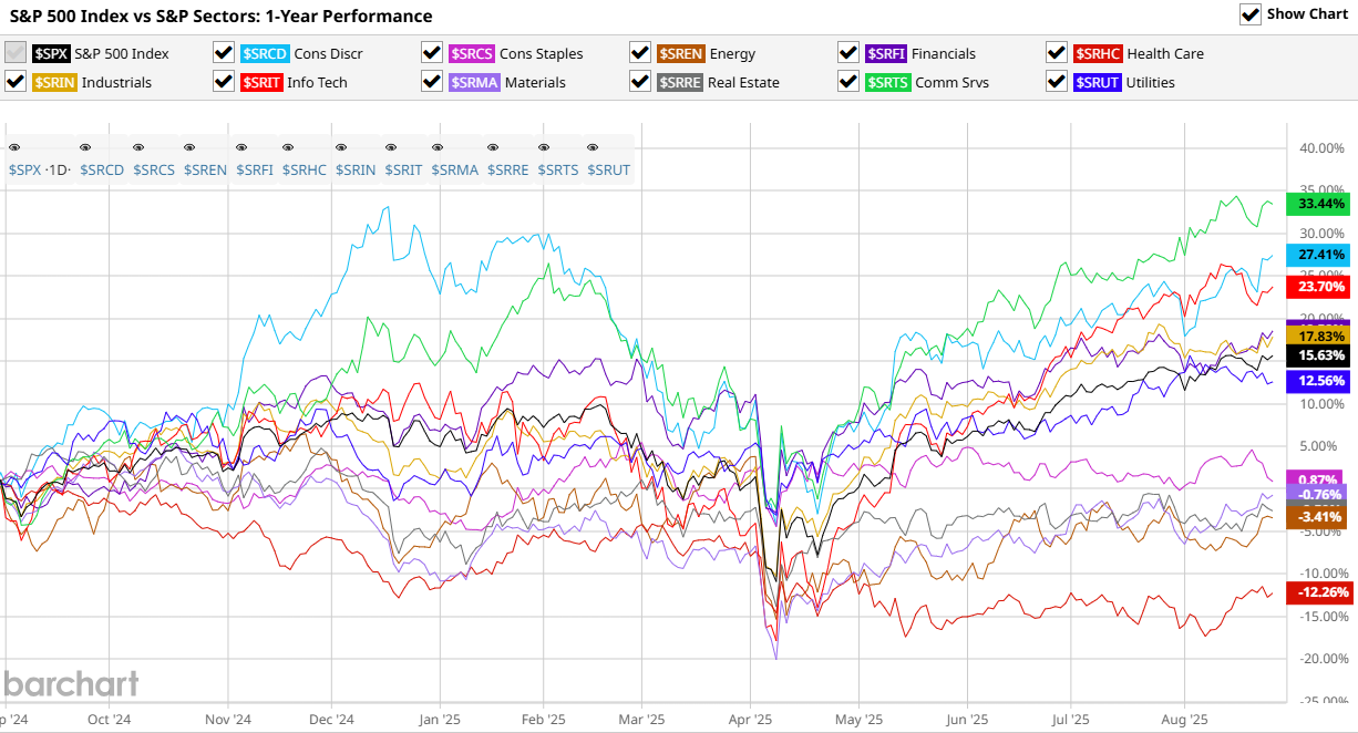 В настоящее время фондовый рынок очень сильно сконцентрирован в технологическом секторе (AI, айти в целом и т.д). Иногда вырываются отдельные сектора (как на картинке ниже), но их вес в общем индексе не сильно влияет на общую оценку.